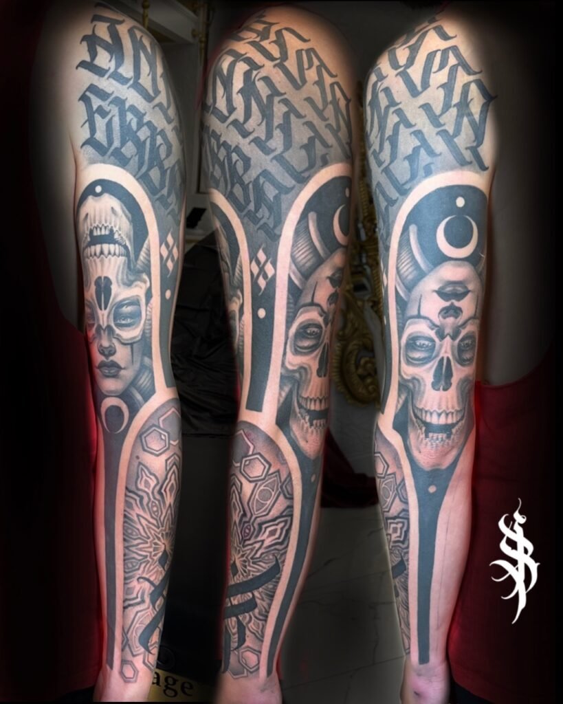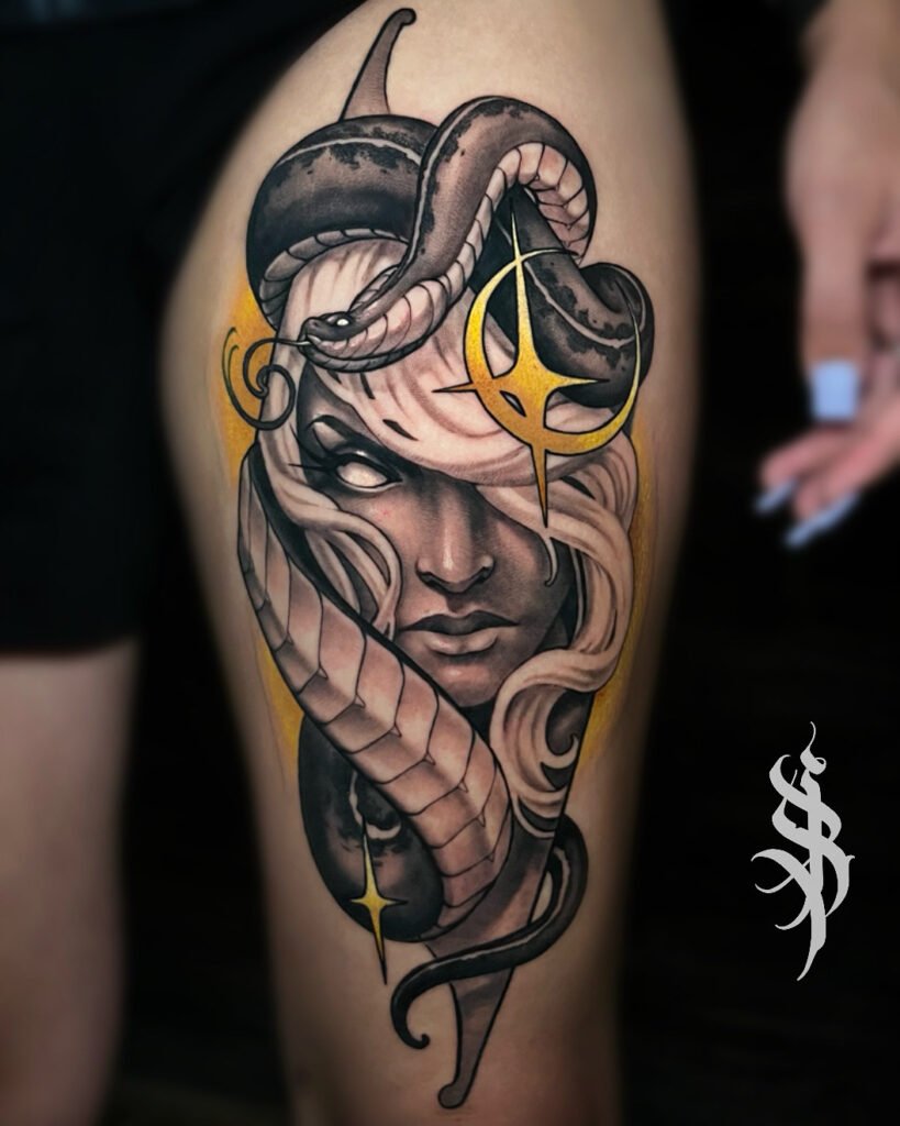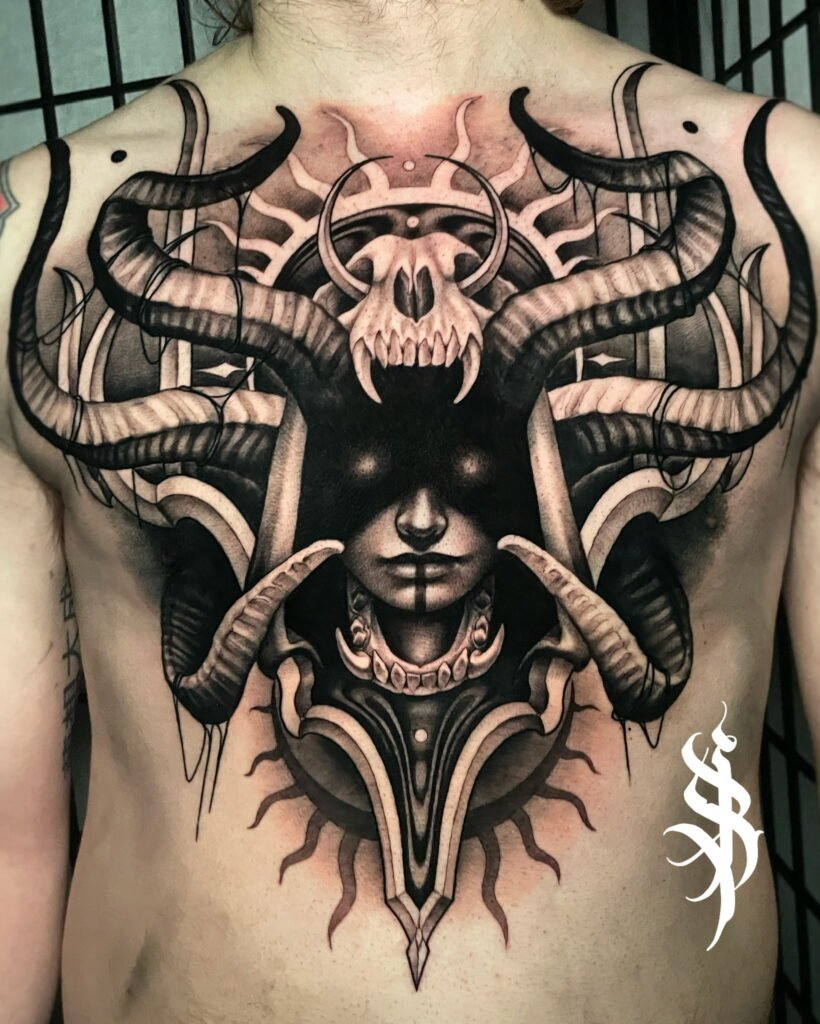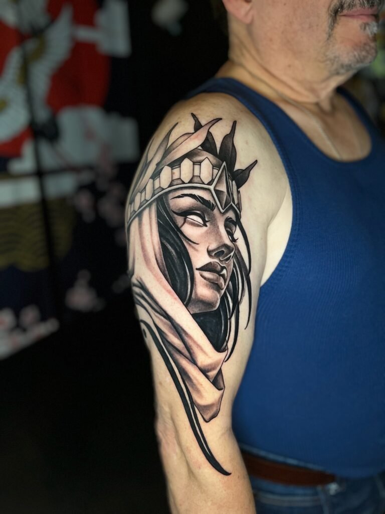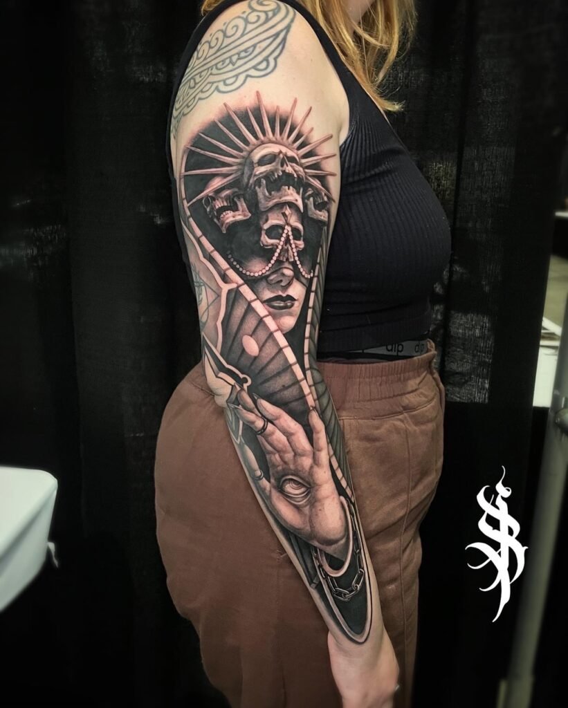 Having been heavily influenced by graphite realism and pen and ink art, Angel’s tattooing style takes on a very dark, saturated black and grey application that provides a striking platform for her realistic yet dreamlike drawing style.